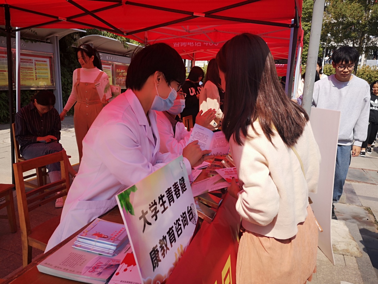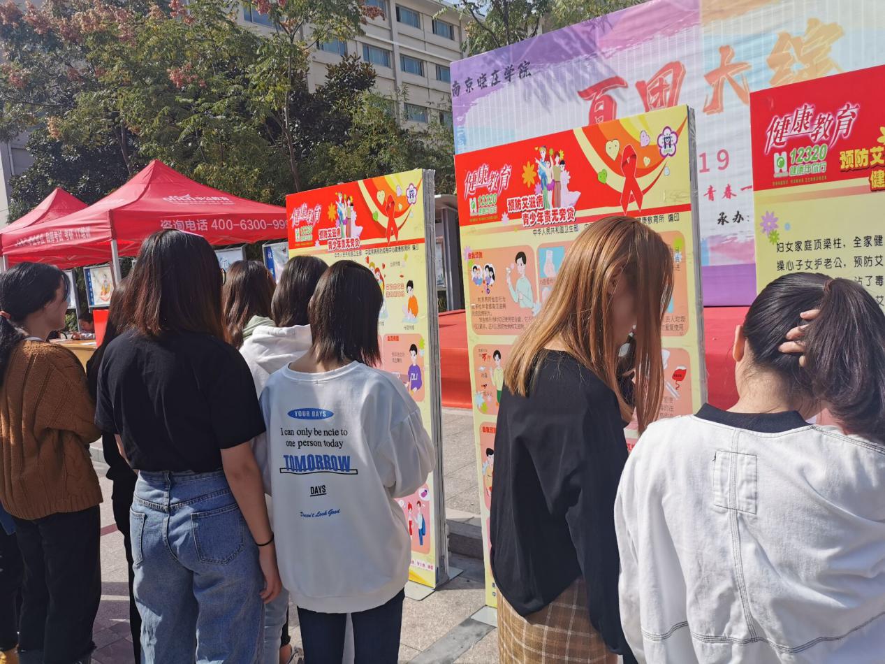 宣传活动形式多样,社工协会志愿者现场发放了解和防治艾滋病的传单,校卫生所的医生准备了免费发放的安全套,在摆台处设立老员工青春健康咨询台,为同学们提供咨询解答,同时结合老员工的身体状况讲解青春期男女同学常见的生理常识和疾病预防知识。过往同学驻足观看预防艾滋病宣传展板。