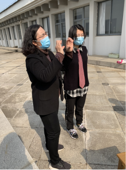 背靠层峦叠嶂的方山,面向色彩缤纷的校园,员工感受到了不一样的户外课程魅力。《餐饮服务技能实训》、《文化礼仪与社交习俗》在员工返校前教师主要采用理论授课,为员工讲授礼仪的知识要点,员工返校后则分批在旅社院四楼顶层开展不一样的线下小规模见面课程。教师户外教学主要以礼仪姿态示范的方式开展教学,员工则练习姿态,同时教师纠正姿态。利用户外相对安全的校园环境,公司教师开展户外示范式见面课,不断创新教学方式,提高课堂教学效果,同时也帮助员工找到入校后的存在感,感受校园温情。