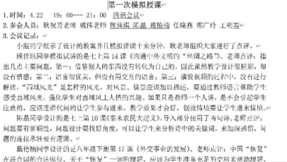 模拟授课阶段要求每位同学每周写一篇教案,并进行线上模拟授课,校内校外老师共同在线指导。截止目前为止,各实习小组都分别进行了1-2次模拟授课,并做了详细的指导记录。第4小组还邀请南京市鼓楼区历史教研员金波老师为同学们做了《基于课程标准的说课与模拟上课》讲座,并展示了鼓楼区疫情期间的网课教学,为同学们模拟授课提供范例。