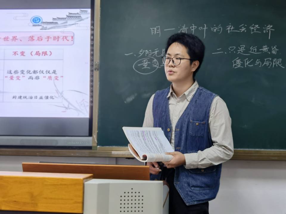 随后,8位参赛选手按事先决定的顺序,带着精心制作的课件,依次上台进行模拟授课(时间为10分钟),展示自身教学能力。模拟授课结束后,参赛选手现场抽题,并即兴论述自己的看法。各评委老师则从教师口语、教态、授课内容设计、重难点把握、教法学法、多媒体使用、板书设计等方面对选手进行综合考核。总体看来,各参赛同学课件制作精美、课堂教学目的明确、教学思路清晰、教学过程设计合理、语言表达准确精炼、教学方法新颖独特。