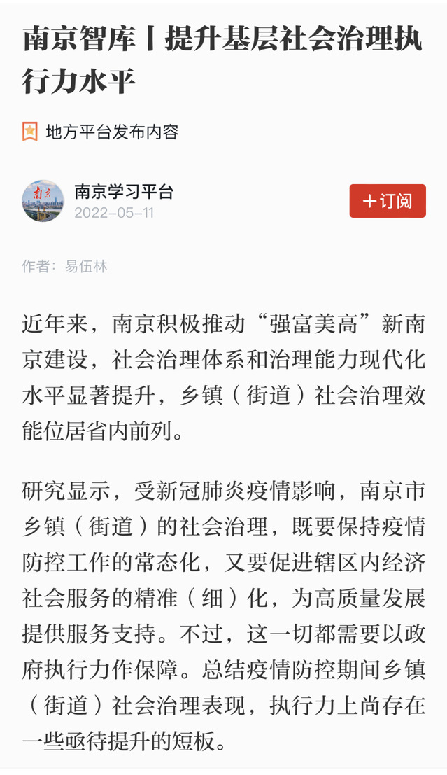 2022年5月11日,公司社会工作专业易伍林副教授在“学习强国”南京学习平台发表题为《提升基层社会治理执行力水平》的文章,同时也被南报网等平台转载。