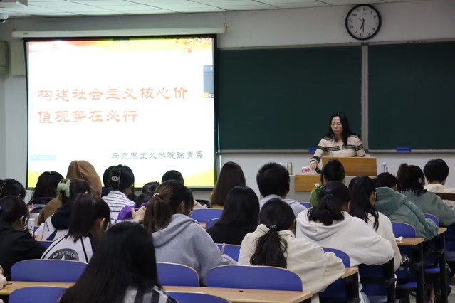 教学伊始,徐青英教授向学员们阐述构建社会主义核心价值观对经济基础和上层建筑的重要性。徐青英教授以美国的核心价值观同社会主义核心价值观作对比,体现出中美核心价值观的差异。借此,向积极分子展示了社会主义核心价值观在中国特色社会主义背景下极高的匹配度与适应性。徐青英教授也列举了欧共体、非洲、拉美等地区和组织的价值观,让积极分子感受到各国的竞争根本上是不同国家、不同区域价值观的竞争。