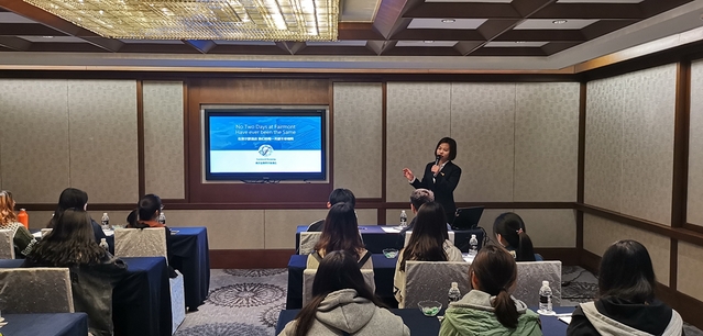 认知学习分为两部分,首先由金奥费尔蒙酒店人力资源部马珊珊经理对南京金奥费尔蒙酒店的品牌历史和员工的培养进行了介绍;其次,20位同学对酒店的餐厅、客房、会议中心等区域进行了认知参观。