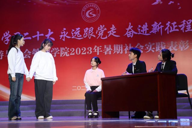 实践成果展示分为“党旗飘扬,青春筑梦想——播撒行知教育新思想”、“党建引领,青春系乡村——开创助农共富新模式”、“党星照耀,青春向未来——谱写中国发展新篇章”三个部分,以舞台剧、朗诵等表演方式向大家分享了他们在社会实践中的难忘瞬间与丰硕成果。
